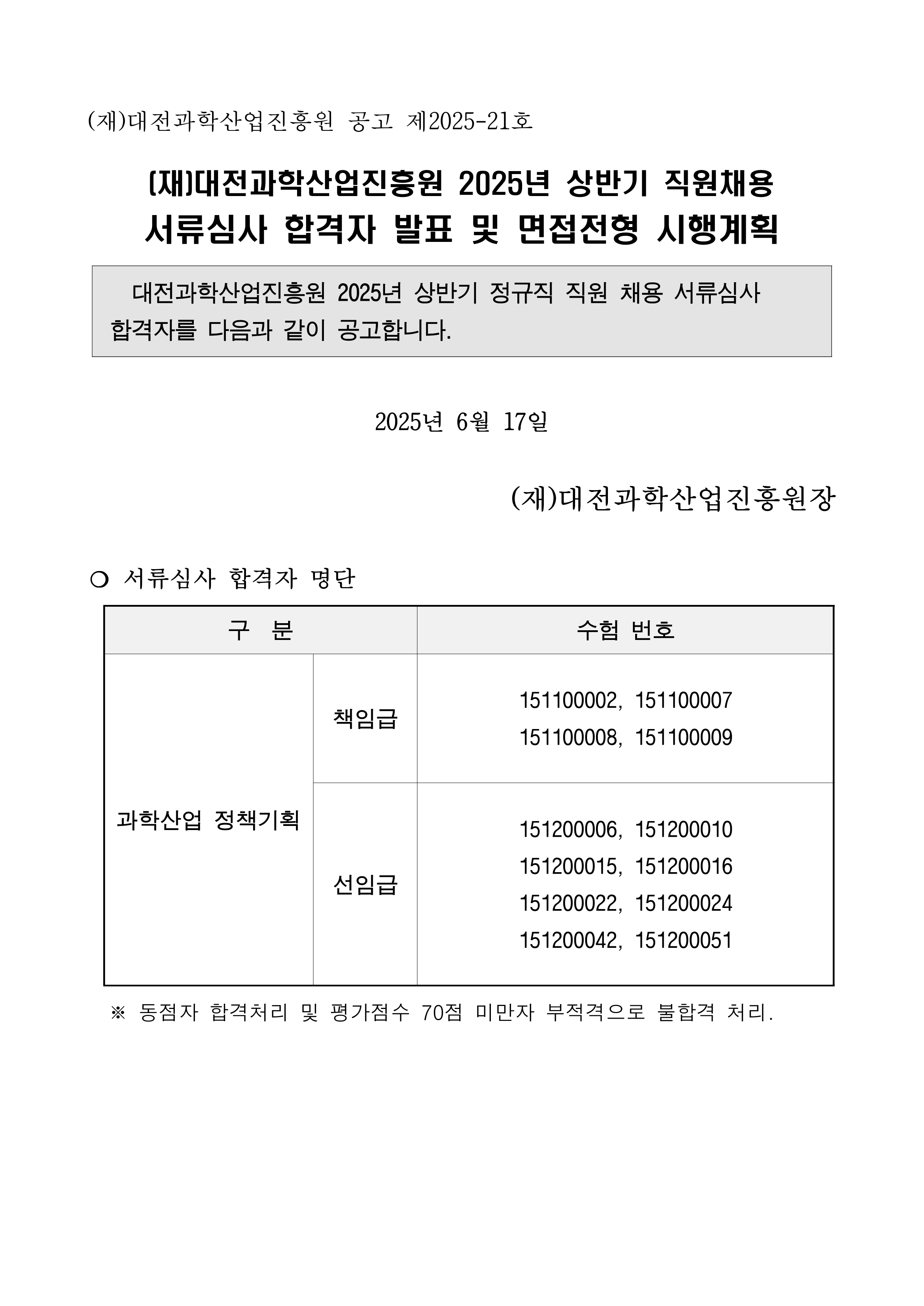 [공고 제2025-21호] 대전과학산업진흥원 2025년 상반기 직원 채용 서류심사 합격자 발표 및 면접전형 시행계획 공고