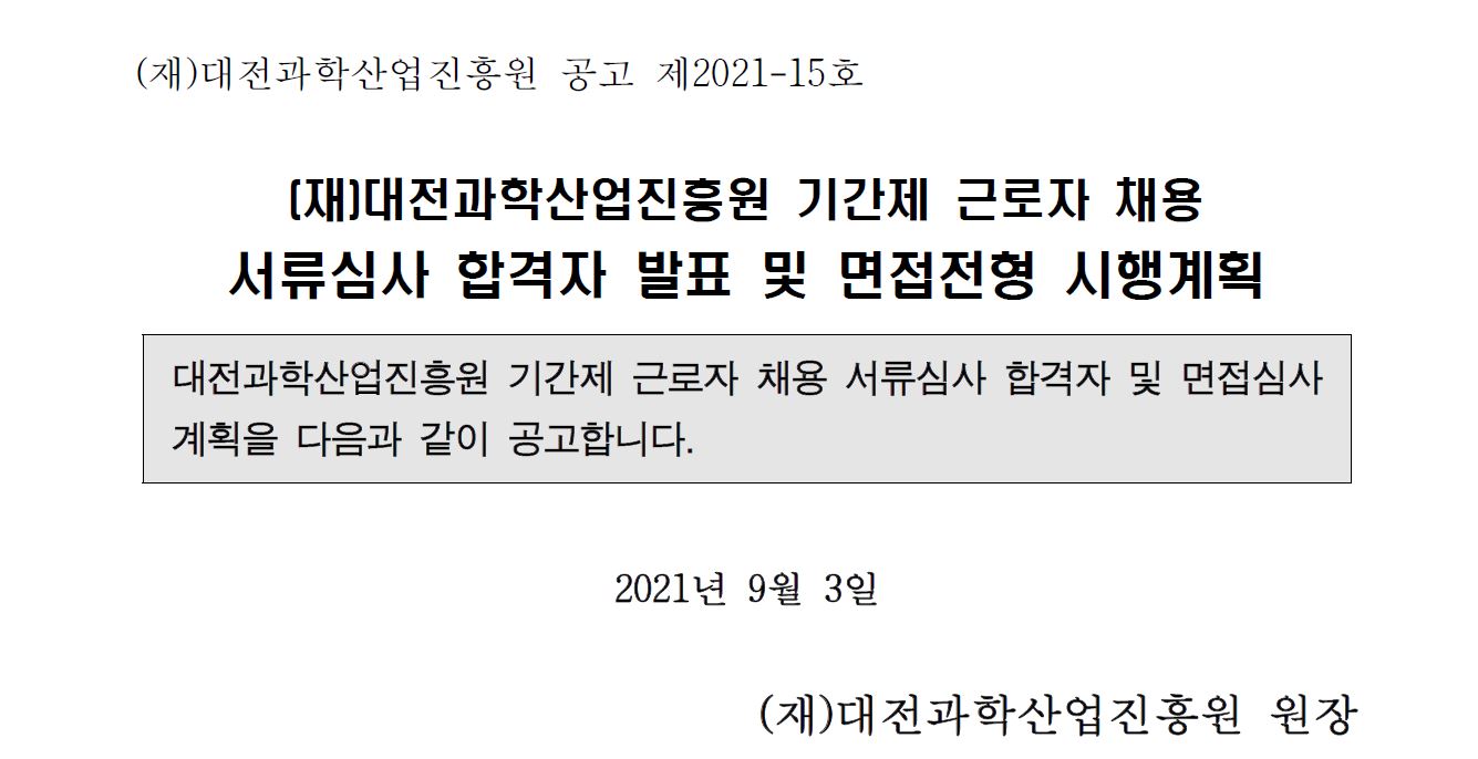 [공고] (재)대전과학산업진흥원 기간제 근로자 채용 서류심사 합격자 발표 및 면접전형 시행계획 공고