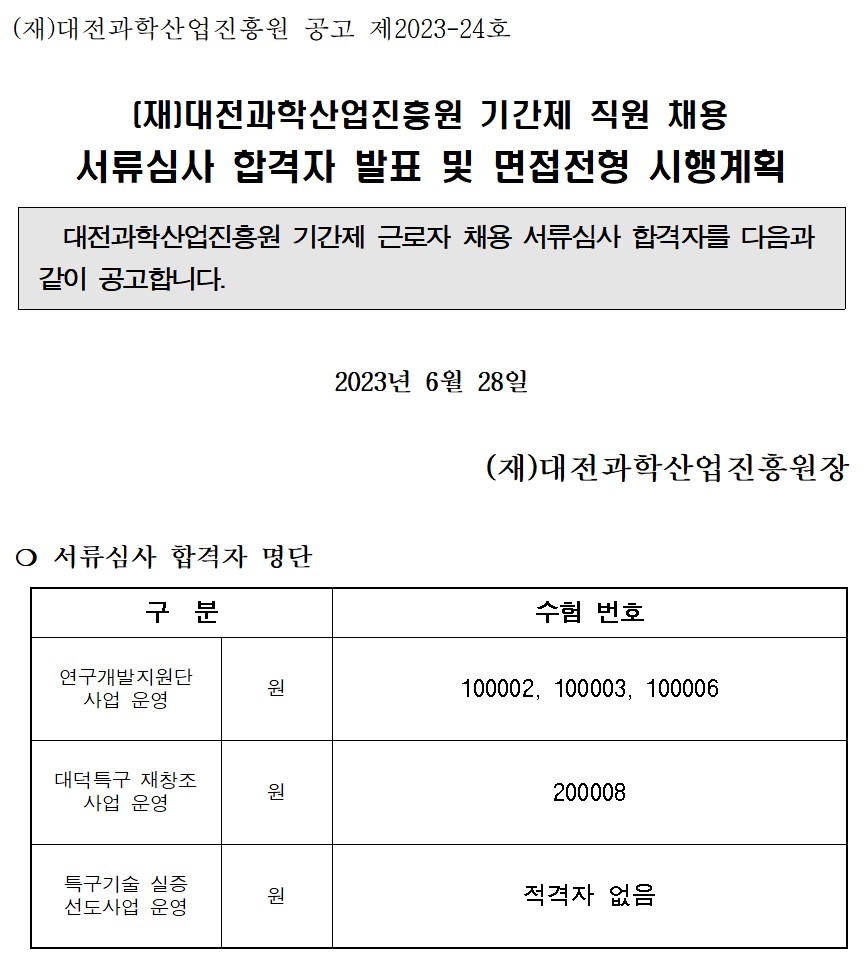 [공고 제2023-24호] 대전과학산업진흥원 기간제 직원 채용(2차) 서류전형 합격자 발표 공고