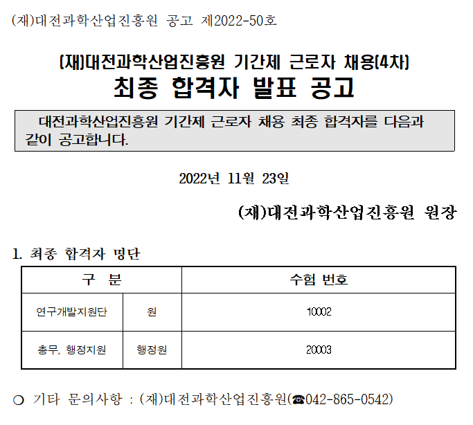 [공고 제2022-50호] 기간제 근로자 채용(4차) 최종 합격자 발표 공고