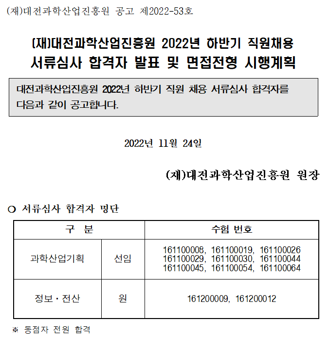 [공고 제2022-53호] 2022년 하반기 직원채용 서류심사 합격자 발표 및 면접전형 시행계획 공고