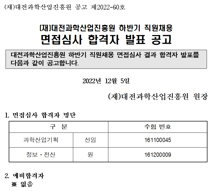 [공고 제2022-60호](재)대전과학산업진흥원 하반기 직원채용 면접심사 합격자 발표