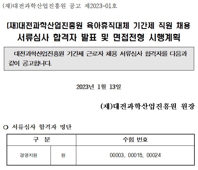 [공고 제2023-01호](재)대전과학산업진흥원 육아휴직 대체 기간제 직원 채용 서류심사 합격자 발표 및 면접전형 시행계획