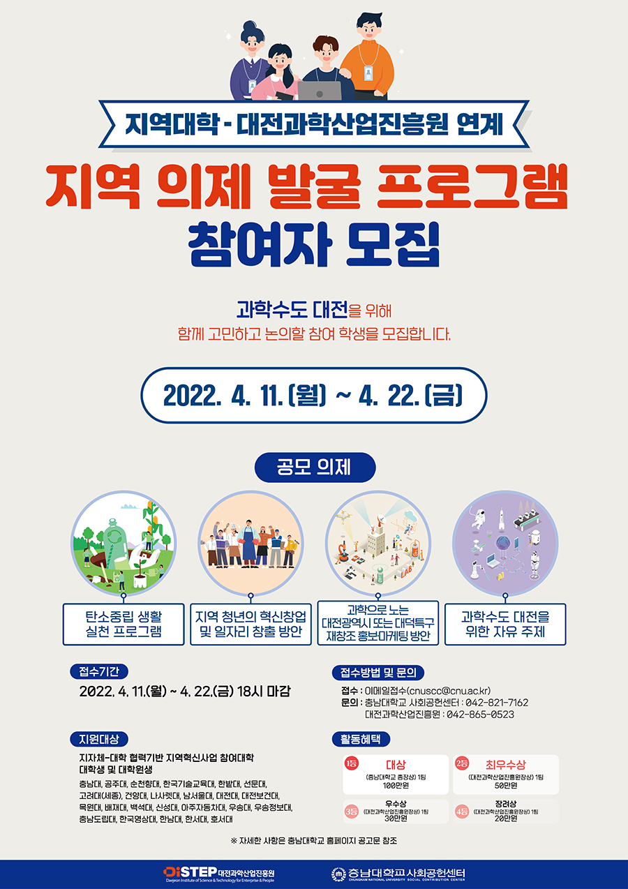 4. 참여혜택: 충남대학교 총장상 및 대전과학산업진흥원장상, 상금 최대 100만원 등